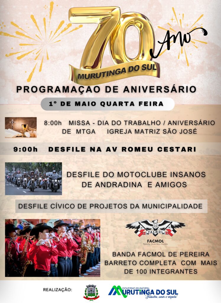 Murutinga comemora 70 anos de Emancipação Politica Administrativa nesse dia 1º de Maio, feriado Nacional (dia do Trabalho). E nete dia promoverá o tradicional desfile na Avenida Romeu Cestari na parte da manhã. Bem de manhã as 8h a Igreja Matriz São José celebrará a missa do dia do Trabalho e na sequencia teremos o inicio dos desfiles cívicos. Participação das crianças dos Projetos da Prefeitura , desfile da galera do vôlei e Basquetebol. O Motoclube ”os insanos’ e convidados também desfilarão pelas ruas e na sequencia a Banda Marcial FACMOL de Pereira Barreto com sua formação completa trazendo mais de 100 integrantes. Vá e leve sua família. Comemore o aniversário de nossa terra. Ainda no mês de Maio teremos mais atrações e eventos a serem divulgados pela Comissão de Festejos.