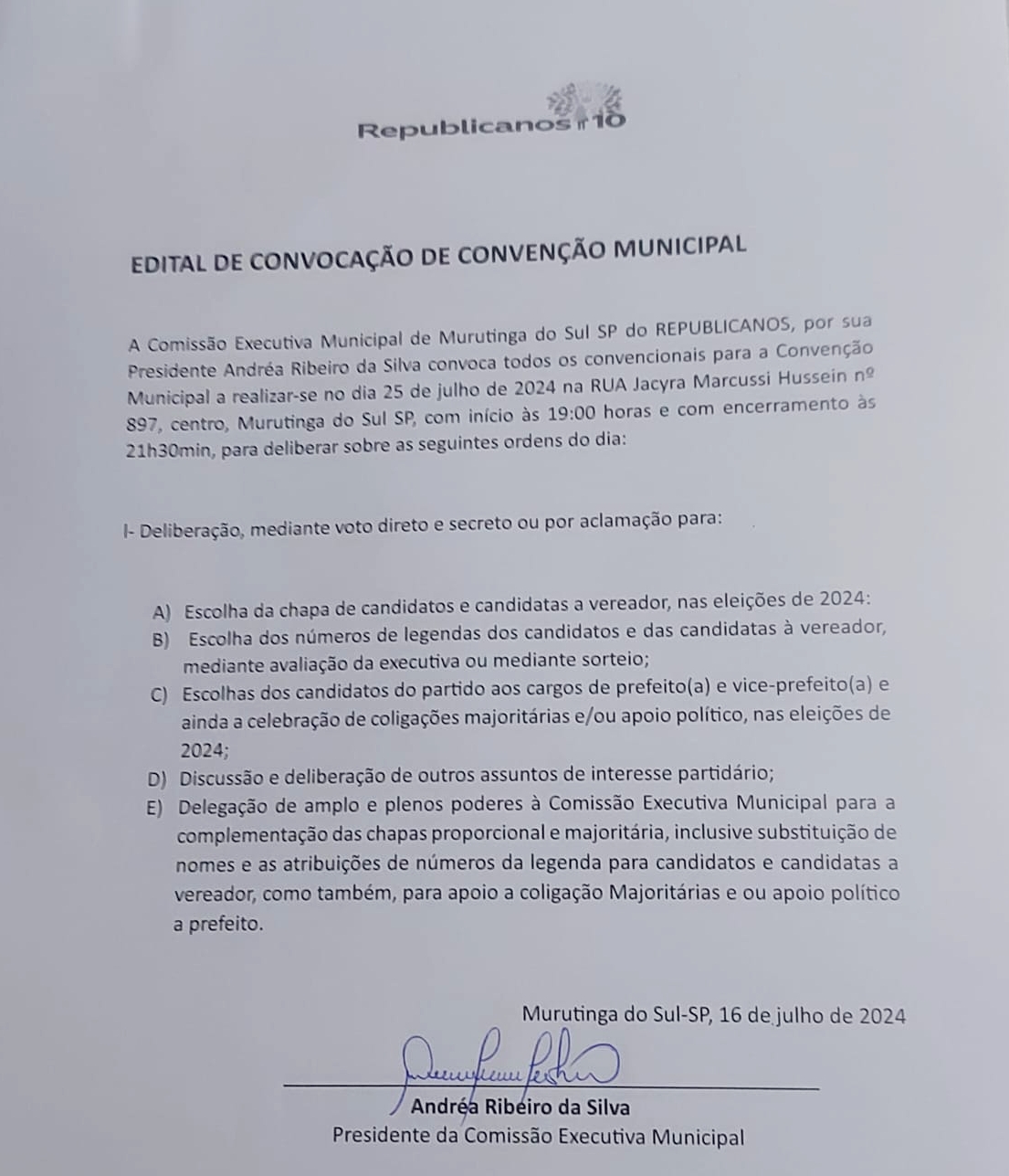 A Comissão Executiva Municipal de Murutinga do Sul SP do PODEMOS, por sua Presidente Andréa Ribeiro da Silva convoca todos os convencionais para a Convenção Municipal a realizar-se no dia 25 de julho de 2024 na R. Jacyra Marcussi Hussein n 897, centro, Murutinga do Sul SP, com início às 19:00 horas e com encerramento as 21h30min, para deliberar sobre as seguintes ordens do dia: