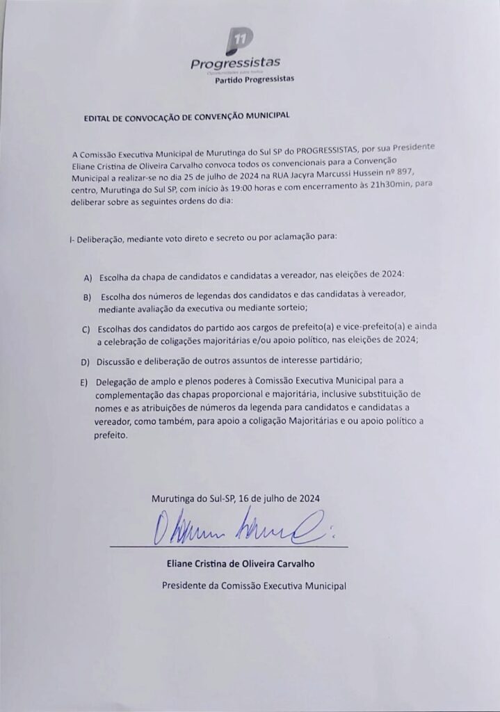 A Comissão Executiva Municipal de Murutinga do Sul SP do PROGRESSISTAS, por sua Presidente Eliane Cristina de Oliveira Carvalho convoca todos os convencionais para a Convenção Municipal a realizar-se no dia 25 de julho de 2024 na Rua Jacyra Marcussi Hussein n? 897, centro, Murutinga do Sul SP, com início às 19:00 horas e com encerramento às 21h30min, para deliberar sobre as seguintes ordens do dia: