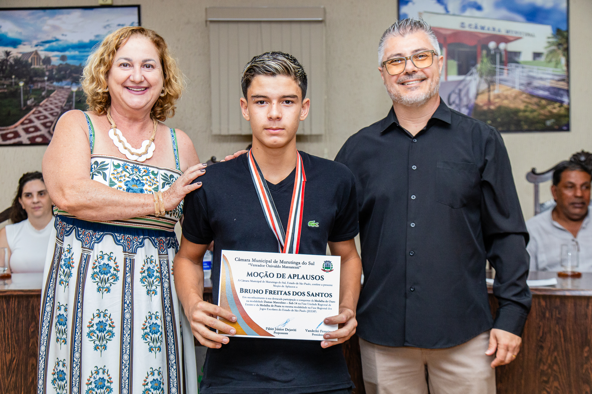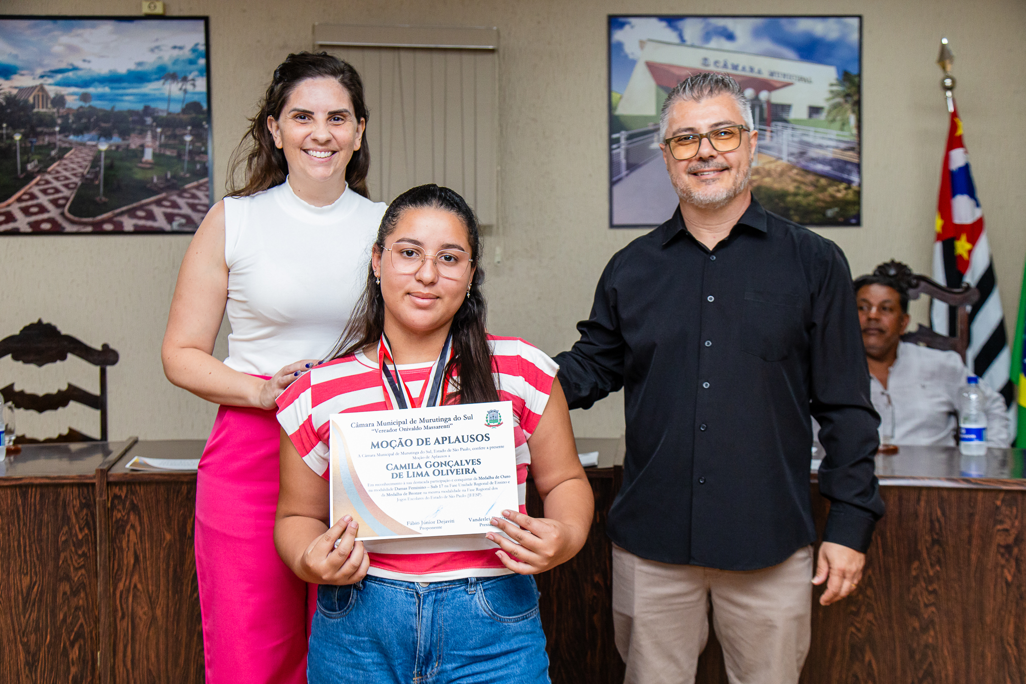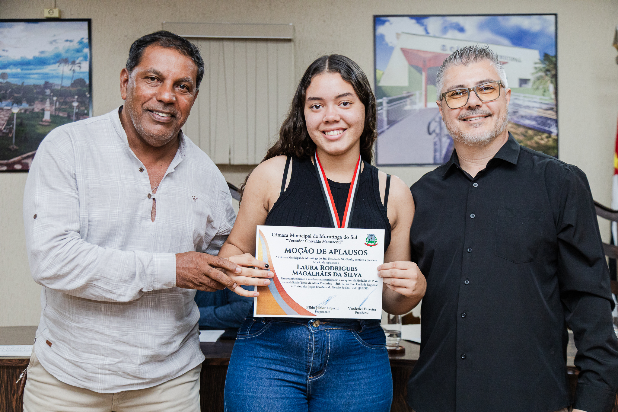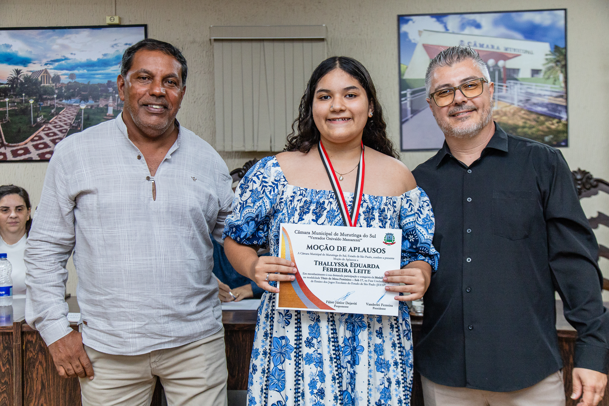 “A homenagem é um reconhecimento ao esforço e dedicação dos alunos e da professora Mariana Peres Pereira, que contribuíram para o sucesso esportivo da cidade de Murutinga do Sul”, destacou o autor das homenagens.